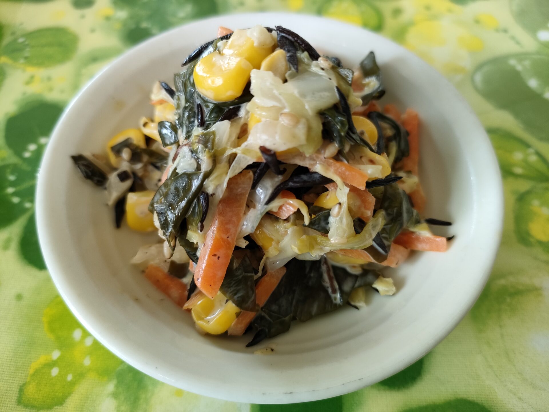 冷やしわかめうどん、高野豆腐の煮物、じゃこ昆布ご飯