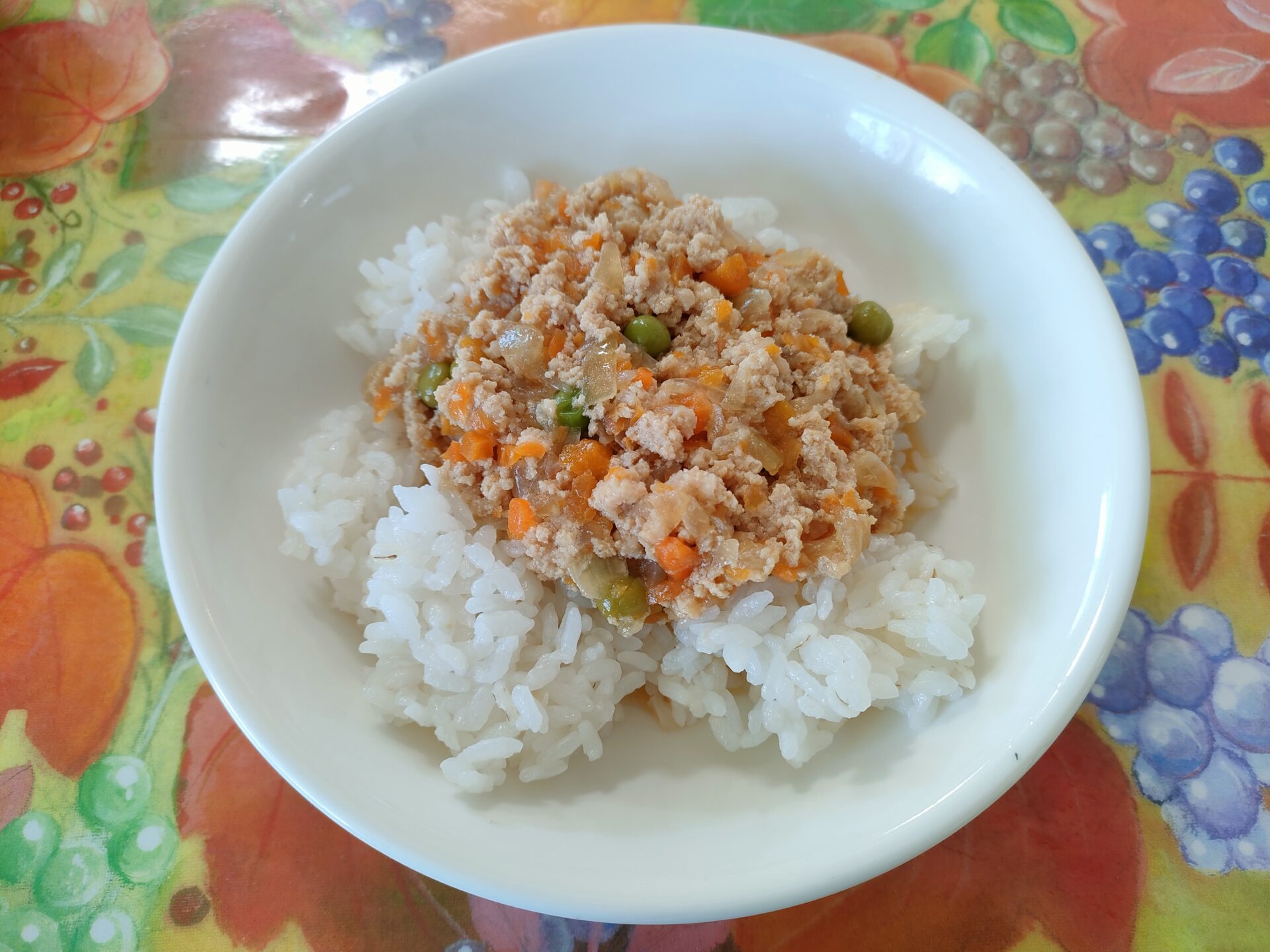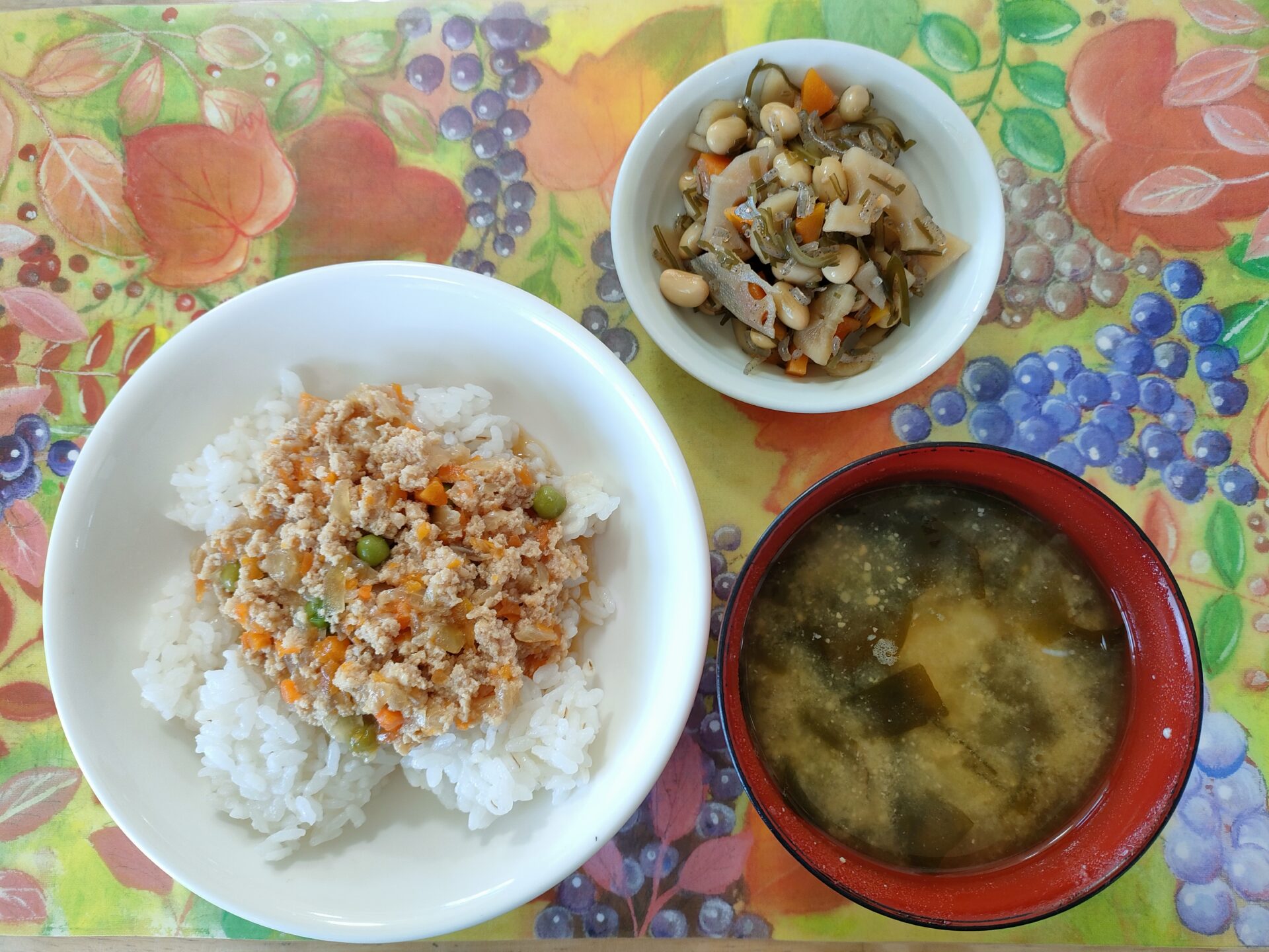 鶏そぼろ丼・五目大豆煮・じゃが芋のみそ汁
