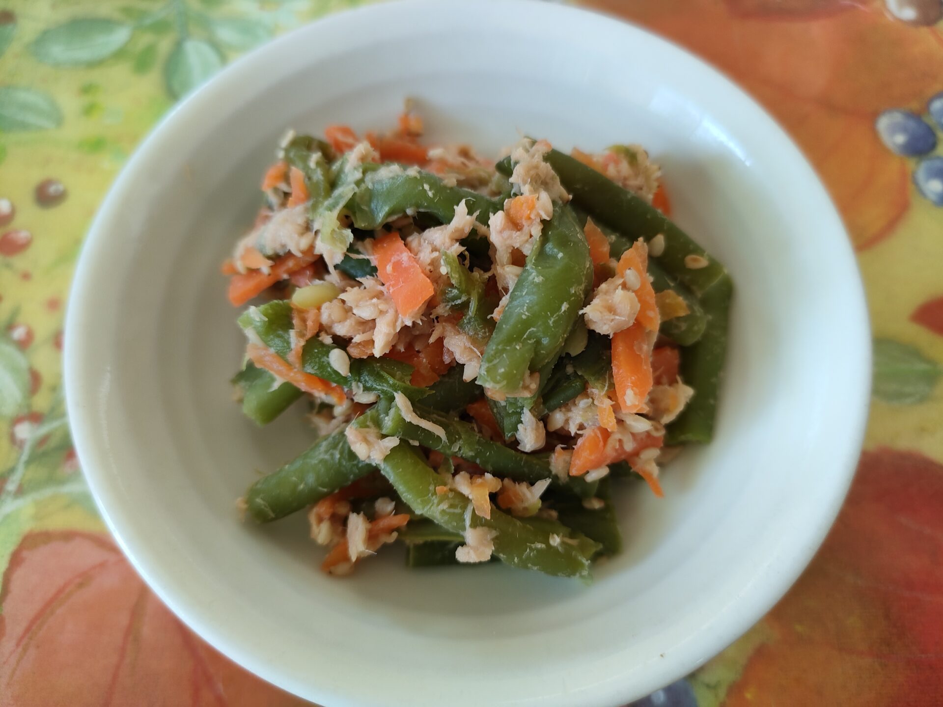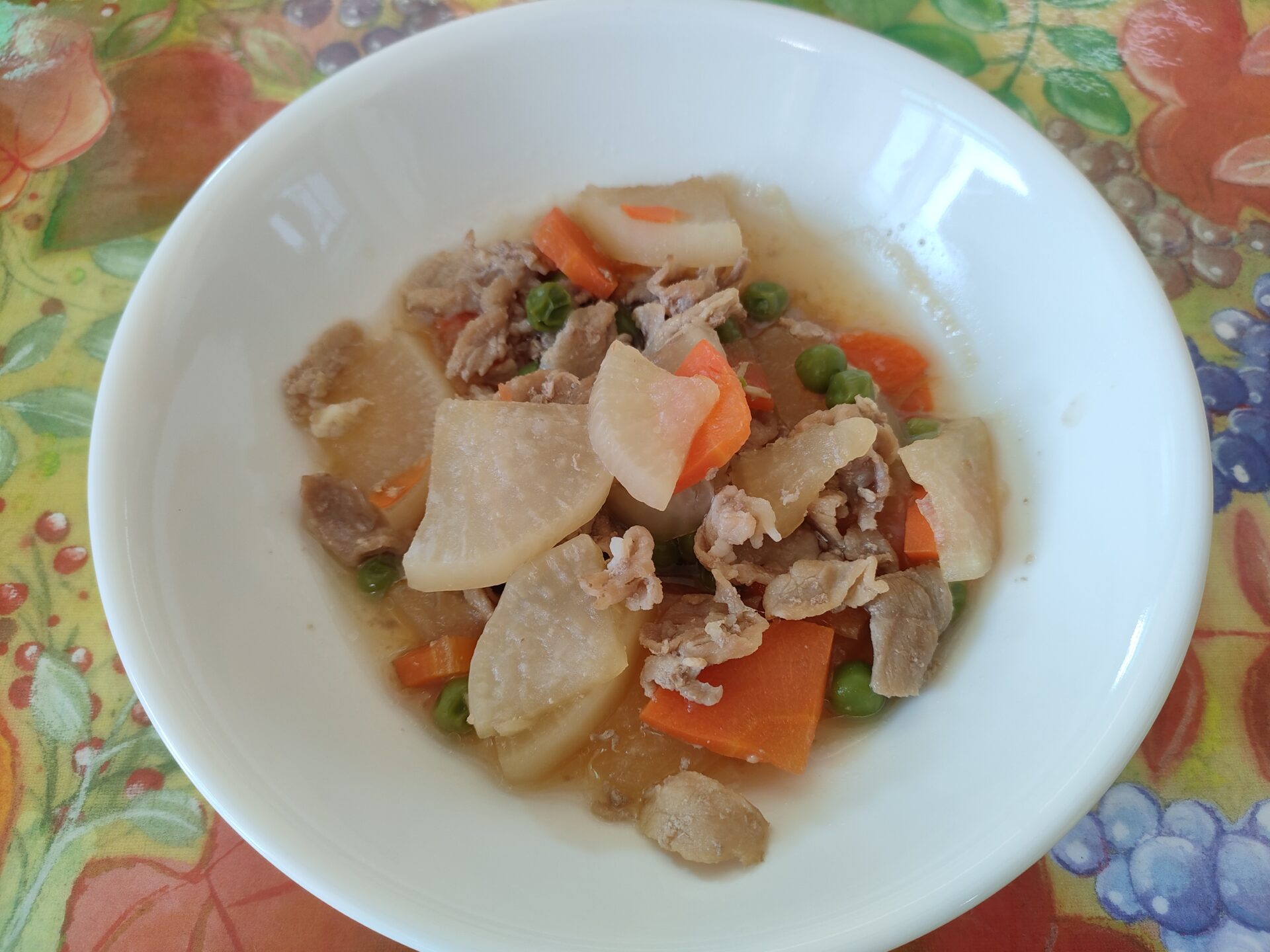 豚肉と大根の炒り煮、いんげんのツナ和え、わかめのすまし汁