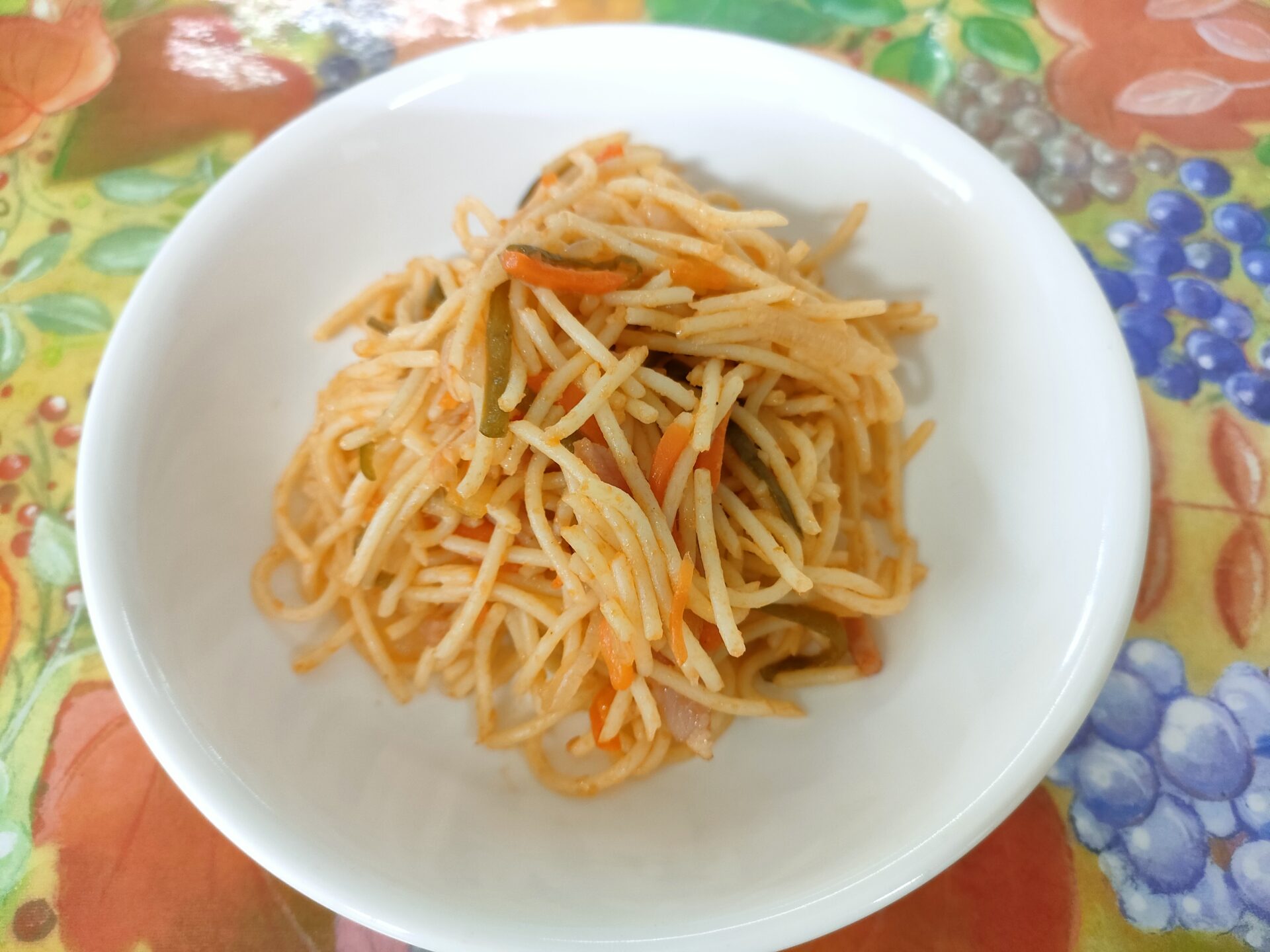 ナポリタンスパゲティ、ビーンズサラダ、きのこのスープ