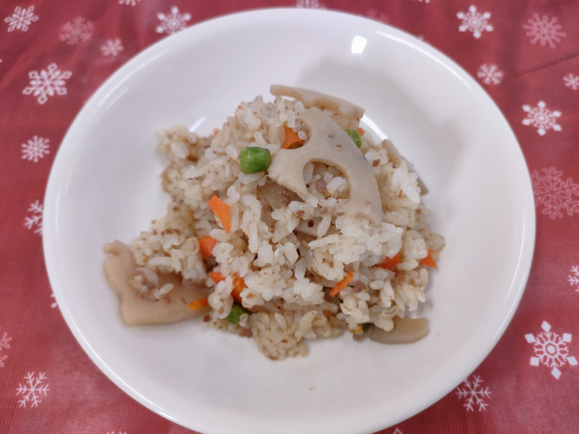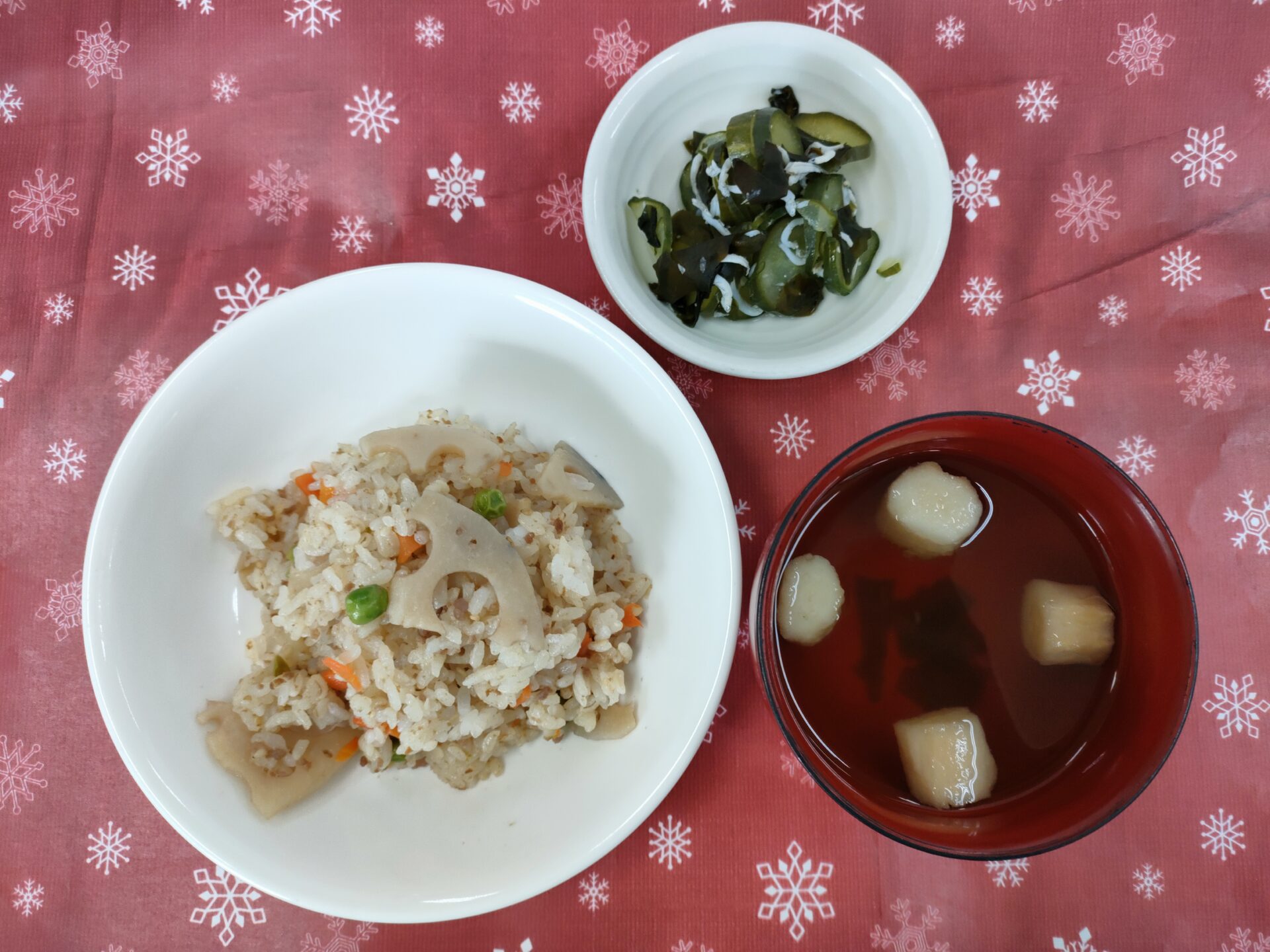 牛肉とれんこんの混ぜご飯・きゅうりの酢の物・お麩のすまし汁
