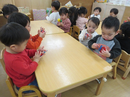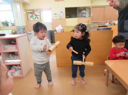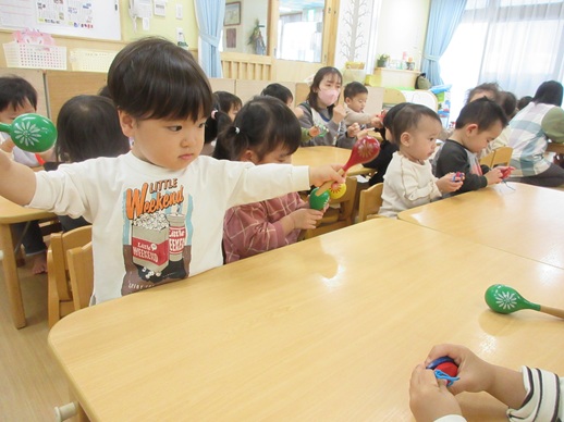 お兄さんやお姉さん達が発表会で使用していた楽器を使って楽器遊びをしました!保育教諭からの説明を聞き、使い方を学びます。「次はどんな音が出るのかな?」と不思議そうな表情やわくわくした表情を浮かべる子ども達。とっても集中していましたよ。