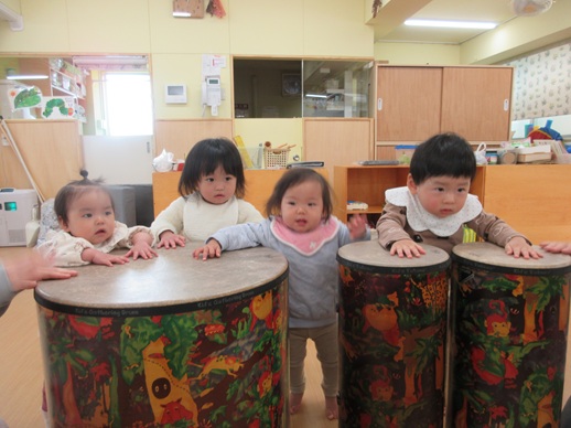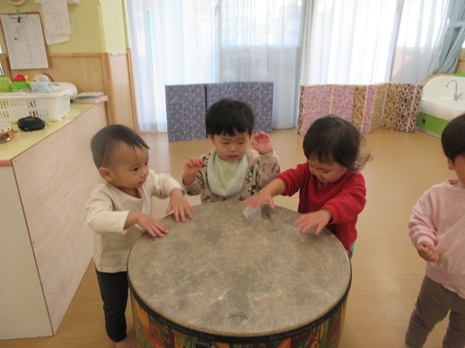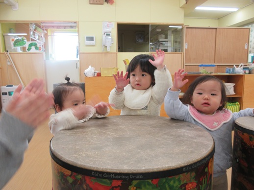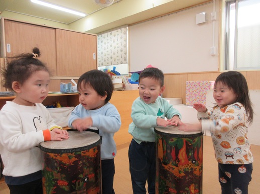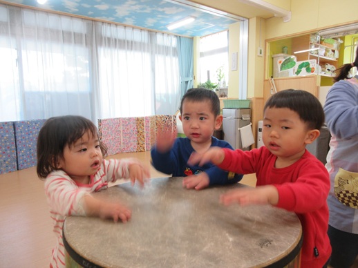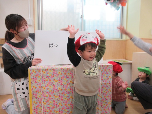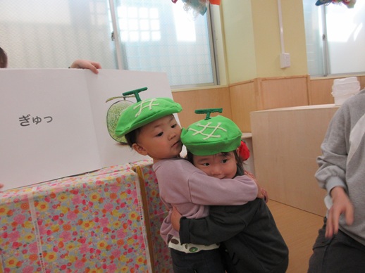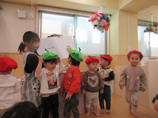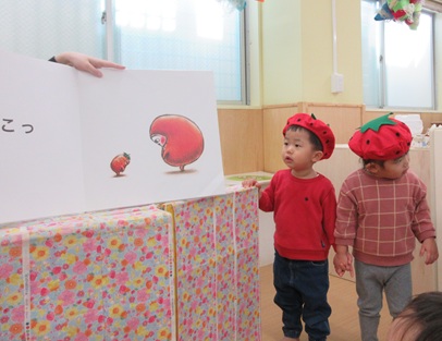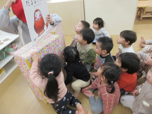 楽器の後には『だるまさんと』の絵本遊びを楽しみました!みんなが大好きな絵本でセリフやポーズもばっちりです◎大きくなったら、お兄ちゃん達のように大きな舞台でお家の人に見てもらえるかな~??今からとっても楽しみですね☆