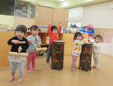 実際に楽器に触れてみると身体の使い方によってさまざまに変化する音色に夢中です。少しずつコツを掴むと、ピアノに合わせたり周りの楽器と合わせる楽しさを感じる事が出来てきました。0歳児さんも大きな楽器を使って全身を使って音を奏でる姿勢がとっても可愛かったですよ。